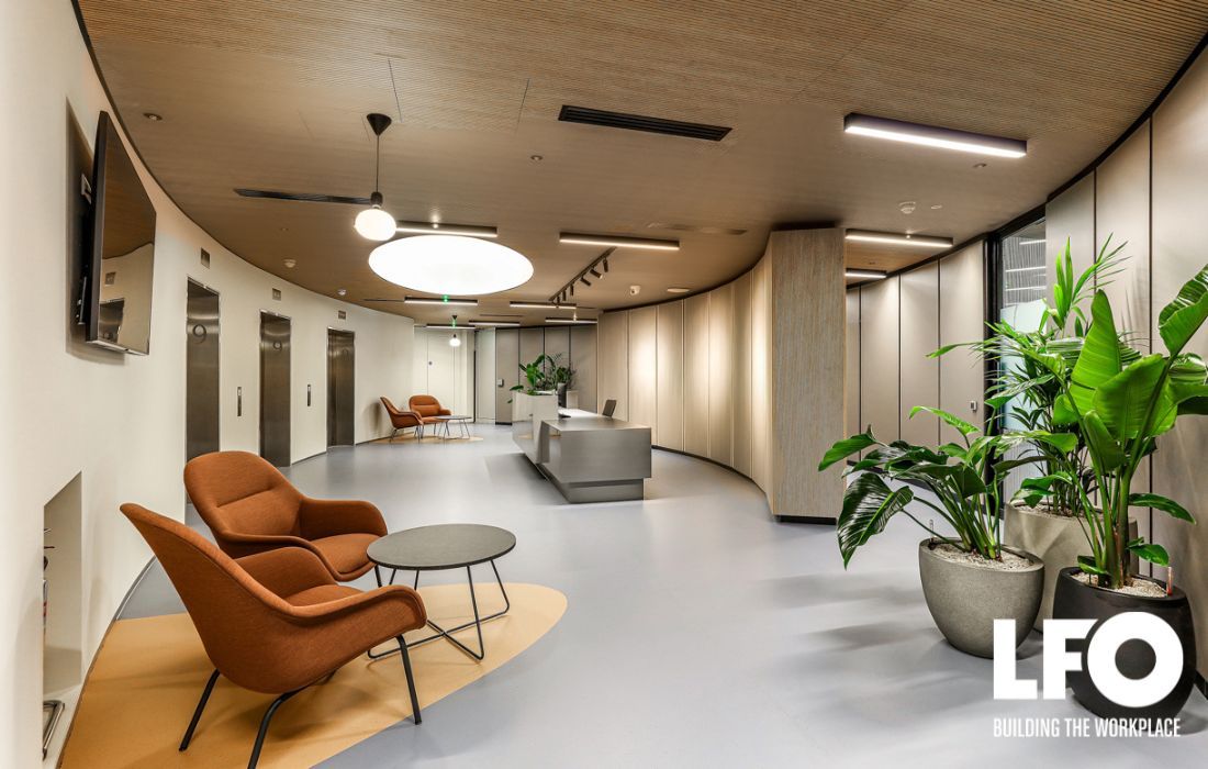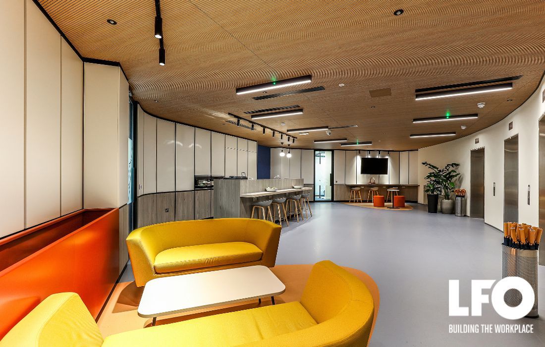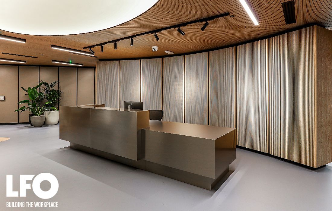 The upper floor features a striking main entrance reception and lift lobby seating area, alongside premium meeting rooms, a feature boardroom, and a client kitchen breakout space. Bespoke wood slat ceilings were incorporated throughout, creating a refined and cohesive design aesthetic.