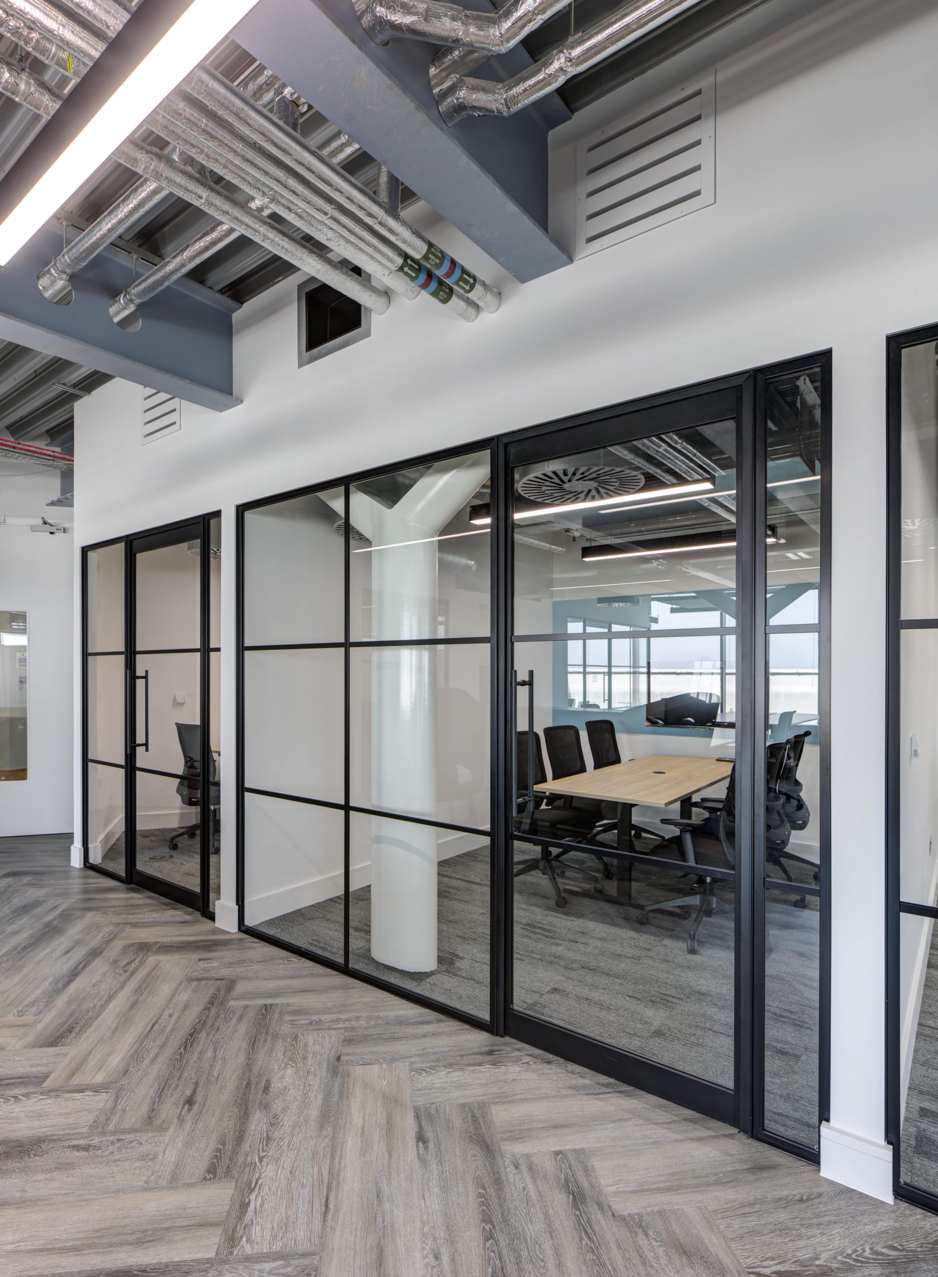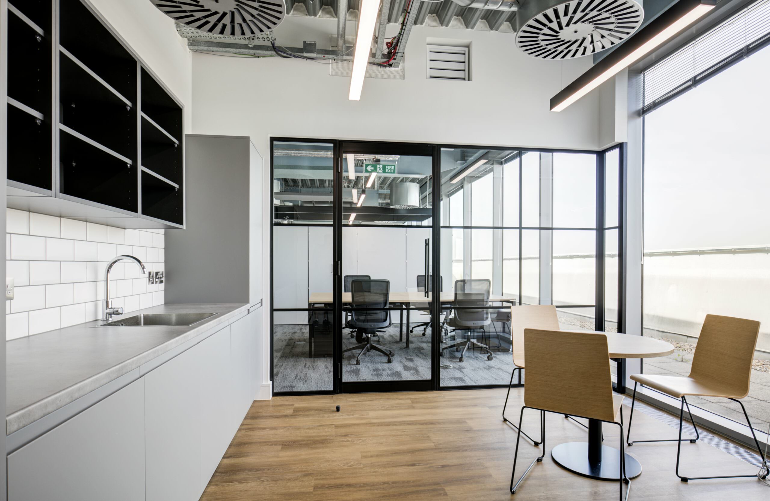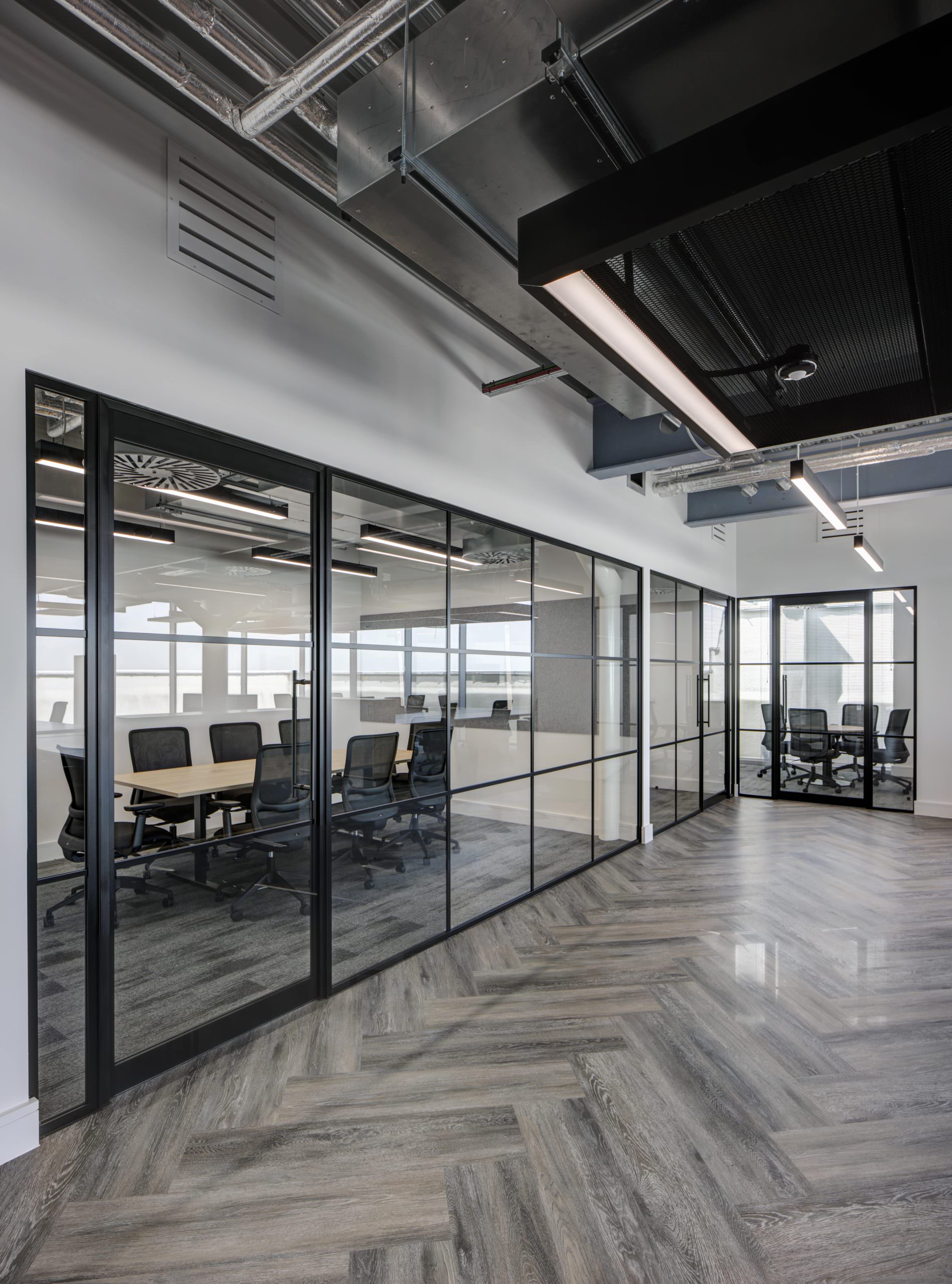 The interior design focused on an “Industrial Chic” aesthetic that complemented the building’s history. LFO installed high-specification Crittall-style glazing and glass doors to form the new private offices and client meeting rooms. This choice provided the necessary acoustic privacy required for a legal practice while maintaining a sense of transparency and light. The industrial feel was further enhanced by the exposed services we had previously installed, now perfectly integrated with the new partition layouts and bespoke glass-fronted offices.