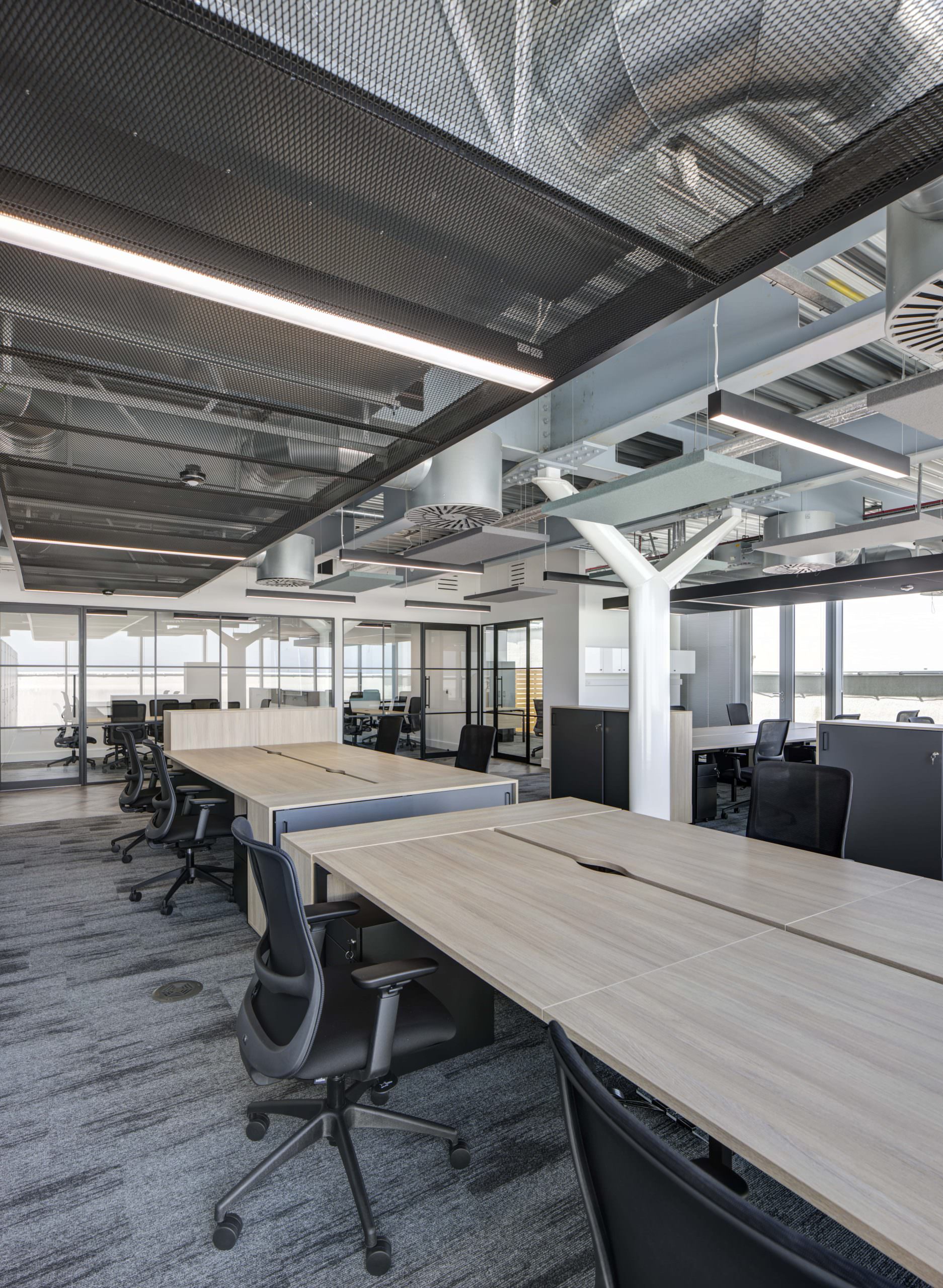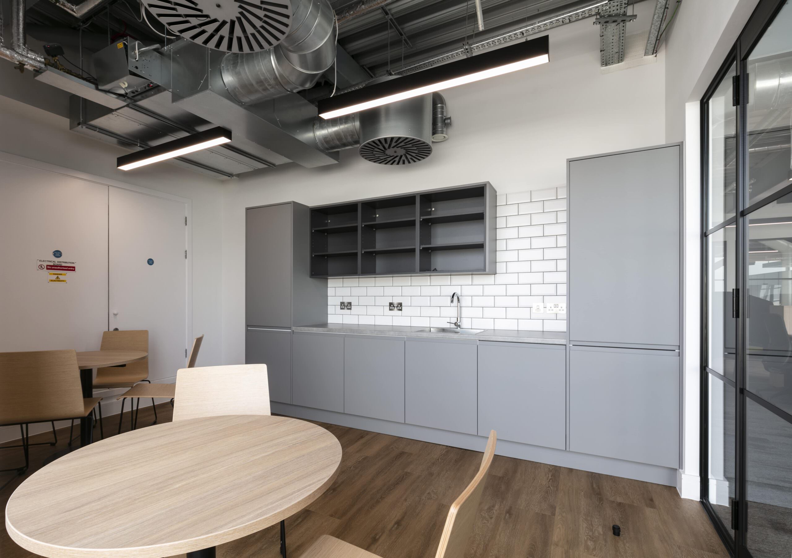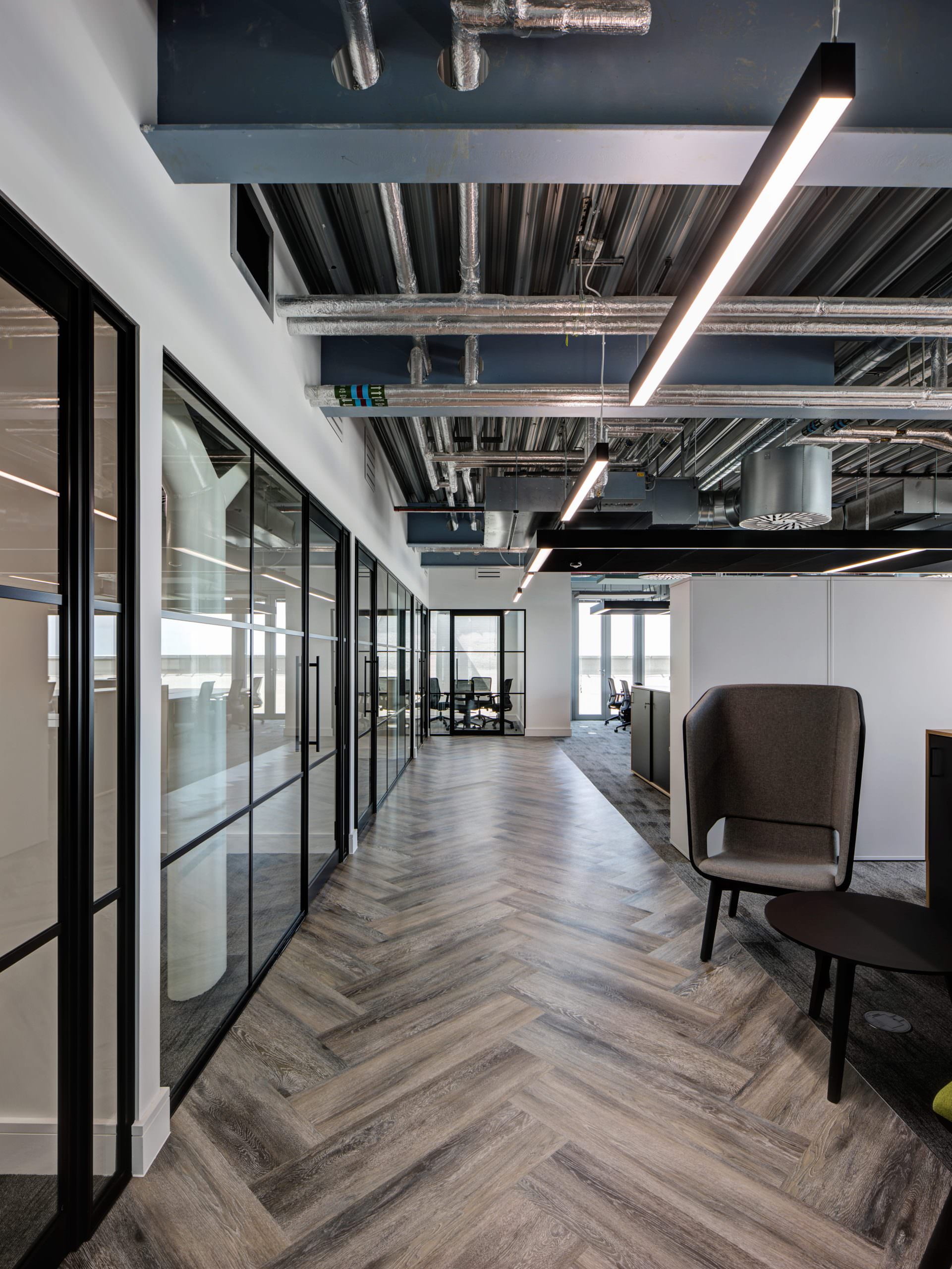 The interior design focused on an “Industrial Chic” aesthetic that complemented the building’s history. LFO installed high-specification Crittall-style glazing and glass doors to form the new private offices and client meeting rooms. This choice provided the necessary acoustic privacy required for a legal practice while maintaining a sense of transparency and light. The industrial feel was further enhanced by the exposed services we had previously installed, now perfectly integrated with the new partition layouts and bespoke glass-fronted offices.