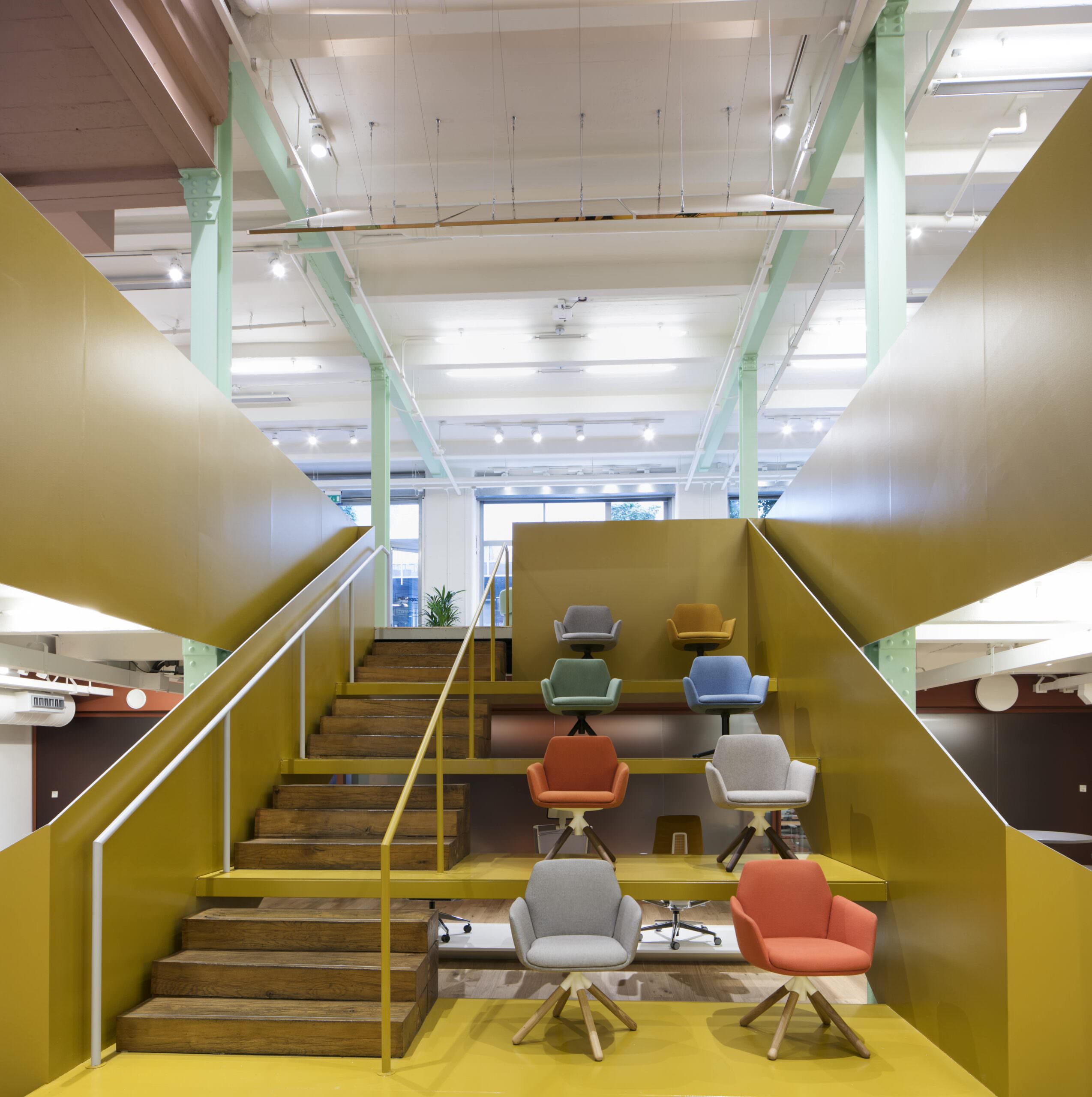 The Mirror Ceiling and Steel Staircase – The architectural centrepiece of the project is a bespoke feature steel staircase that serves as a multi-level gallery for the brand’s iconic chair ranges. To overcome the natural light limitations of a basement level, LFO engineered a “Mirror Ceiling” installation above the stairwell. This innovative feature reflects natural daylight from the ground-floor windows deep into the lower level, while simultaneously creating a dramatic visual effect that showcases the designer products from multiple angles, enhancing their form and materiality.