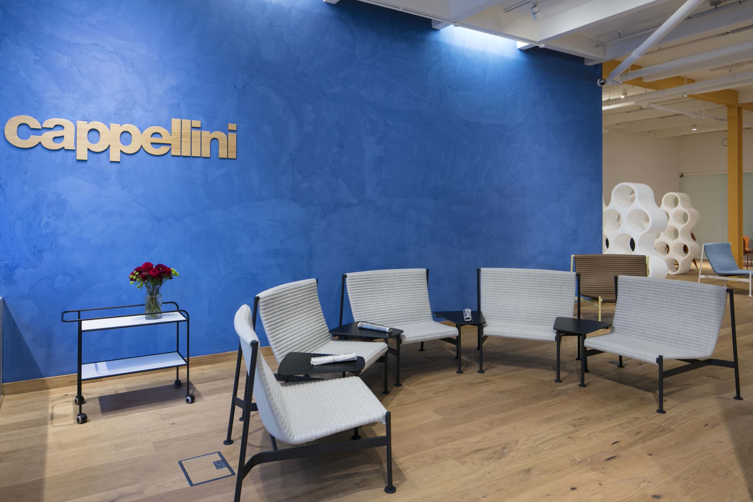 The ‘Front of House’ Experience: Upon entry, clients are greeted by an impressive, custom-formed reception desk surrounded by curated displays of product fabrics and design literature. LFO designed the floorplate to be fluid, featuring expansive open zones where Cappellini’s world-renowned furniture can be showcased in situ. To support private consultations, we installed a premium Italian-branded glazing system to form sleek meeting rooms and executive offices. These spaces were complemented by a bespoke “feature lighting” scheme, strategically designed to highlight the textures and contours of the furniture “centrepieces” on display.