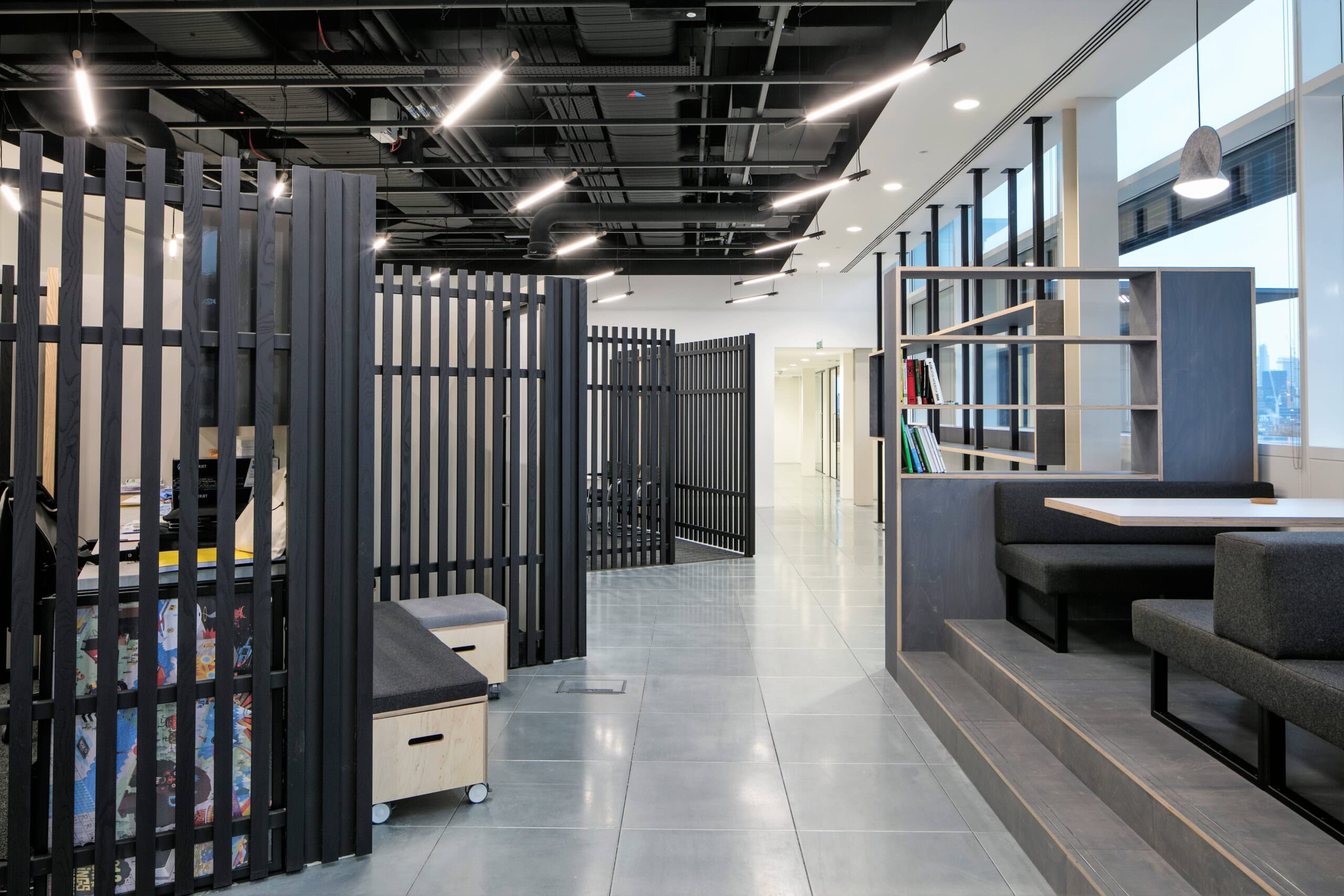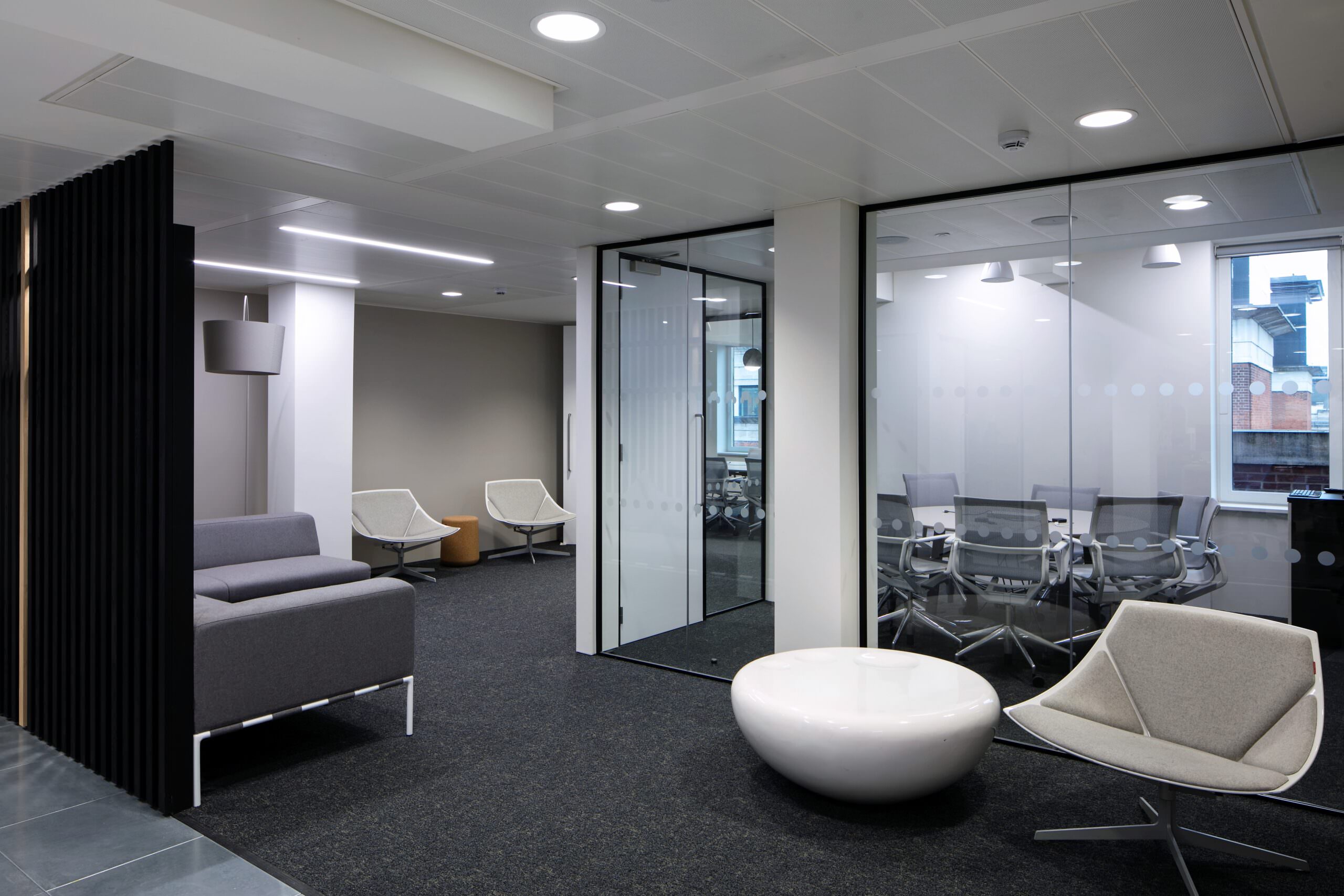 The Kinetic Reception & Modular Pods – The project’s aesthetic “hook” is the bespoke reception area, which features a unique, feature moving desk designed to offer flexibility for events and day-to-day operations. Directly behind this central hub, LFO constructed a series of bespoke open meeting pods. These semi-private spaces were finished with precision-engineered wood-slat walls, providing a warm, tactile contrast to the modern office environment. This clever use of modular design allows for “quiet zones” within the open-plan layout, catering to the diverse working styles of a modern digital agency.